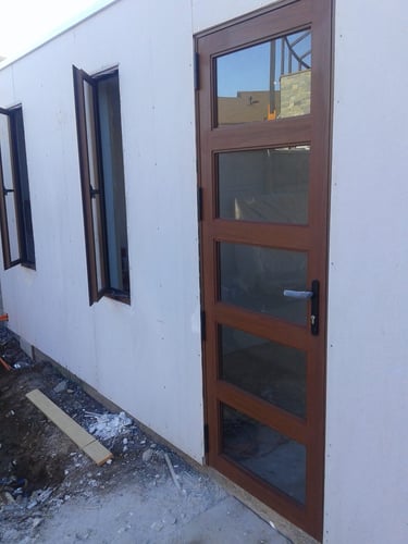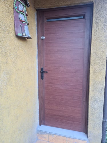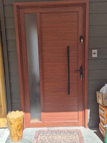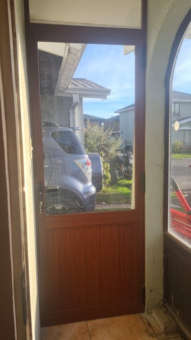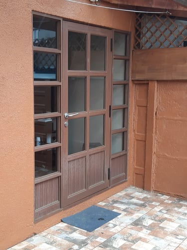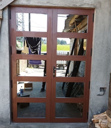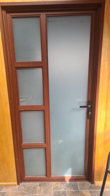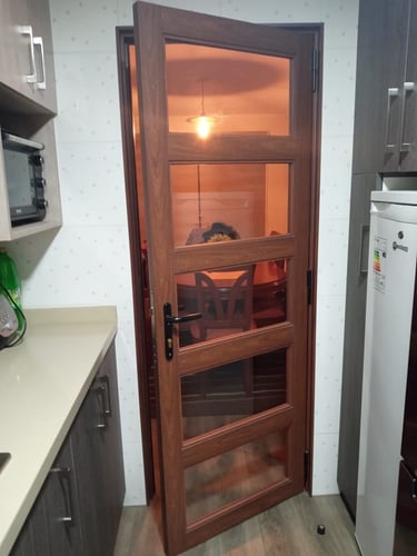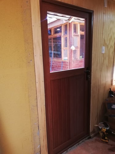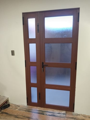 También puedo trabajar con acabados en imitación madera, como los de las fotos, que aportan calidez sin sacrificar durabilidad. Estas puertas son ideales para entradas principales, quinchos, terrazas o cualquier espacio donde quieras buena luz, buena ventilación y un toque de diseño.